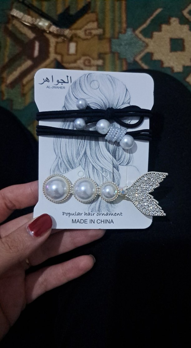 Parlak beyaz boncuklu, gotik tarzda plastik saç aksesuarları seti; lastik toka ve incili taş detaylı klips içerir. ✨