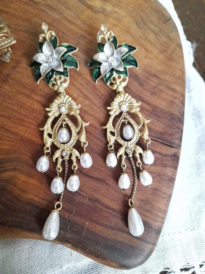 Vintage tarzda, yeşil ve beyaz inci detaylı çiçek desenli,1.kalite pirinç metal işçilik küpeler. Düğün ve davetlerde klasik şıklık için uygun. Hediye kutusu ile gönderilecektir. Gardropsumdaki diğer ürünlere bakmadan geçmeyin.
