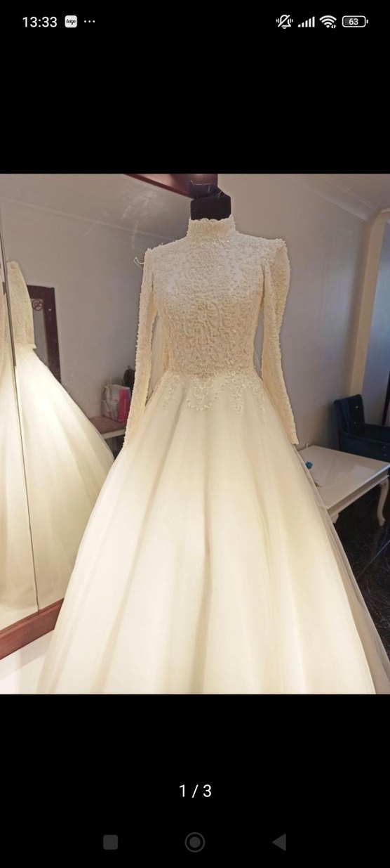 Tertemiz, bir defa giyildi, 36/38 beden uyumlu özel dikimdir eteği hayal tül üzeri inci detaylı yanında duvağı da verilecektir. Ekru rengindedir.