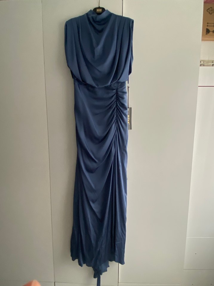 İndigo renkte, yüksek yaka ve kolsuz, drapeli tasarıma sahip uzun abiye elbise. Bir düğün için alındı fakat cenaze sebebiyle düğüne katılamadığım için giyilmedi sadece mağazada denendi ve buraya yüklemek için giydim tüm deteylar mevcut 38-40 bedene uyacaktır. Şu an 38 bedenim hafif bolluk var. Son görsel mağaza denediğim görseldir. Aldığımdan beri kendi hurcunda durmakta