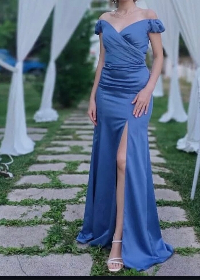 İndigo uzun yırtmaçlı kayık yaka gece elbisesi