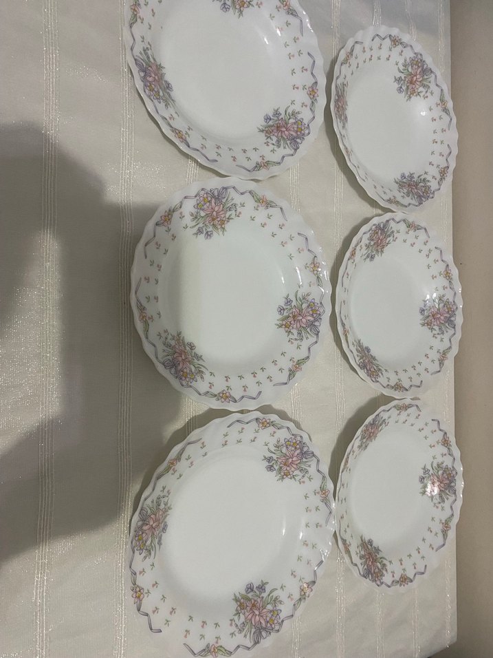Vintega , Çiçek desenli ve dalgalı kenarlara sahip beyaz porselen tabak seti, altı parçadır. , derinliği 4 cm , yeni hiç bir sorunu yoktur damgalı ğründür