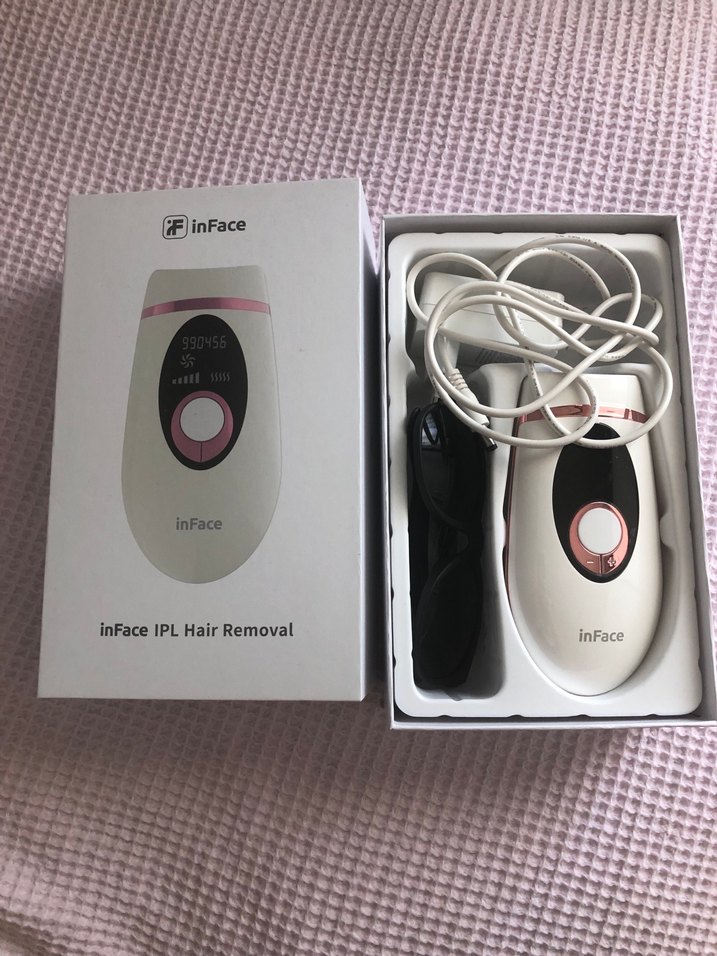 inFace IPL lazer epilasyon cihazı, etkili tüy azaltma sağlar. Beyaz renkte, kullanıma hazır aksesuarlarla birlikte gelir. Kaç atış kaldığı son fotoda görünüyor Çok az kullanıldı Orijinal
