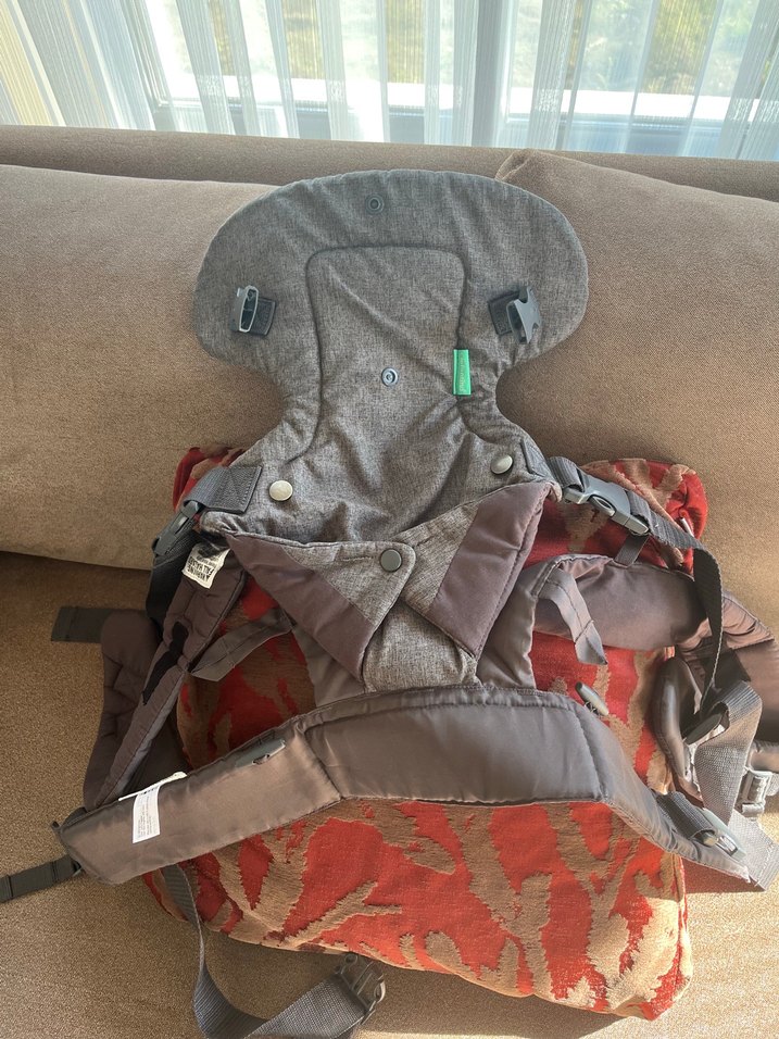 Gri renkli bebek taşıyıcı, ayarlanabilir kayışlar ve yastıklı destekle rahatlık sağlar. Güvenli kapanış ve nefes alabilen kumaş içerir.