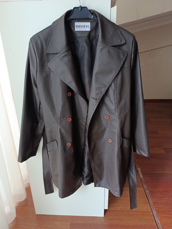 INFINITY kahverengi deri görünümlü ceket, normal boyda ve rahat kesimdir. Sokak stili ve ofis kullanımı için uygundur. Blazer kemerli rahat kesim,yaka kısmında kçük bir renk solukluğu var ,son fotoda