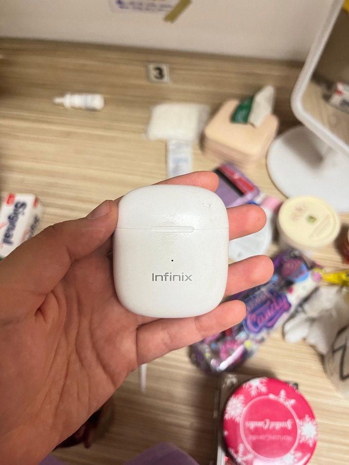 Infinix markasına ait beyaz kablosuz kulaklık, taşınabilir ve kullanışlı bir kulağı çalışmıyor