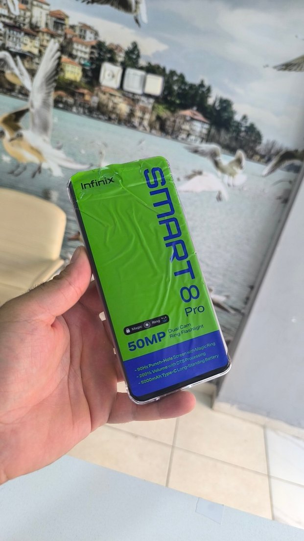 Infinix SMART 8 Pro, 50MP çift kamera ve canlı yeşil renkte. 5000mAh batarya ve hızlı şarj desteği sunar.