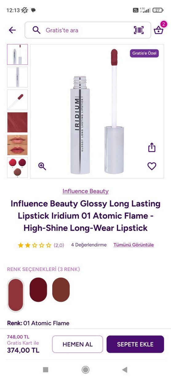 Influence Beauty Glossy Long Lasting Ruj Atomic Flame, parlak ve kalıcı bordo tonunda uzun süre kalır.