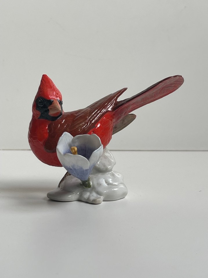 Kırmızı seramik kuş figürü, beyaz çiçekle birlikte detaylı ve parlak bir görünüme sahip.