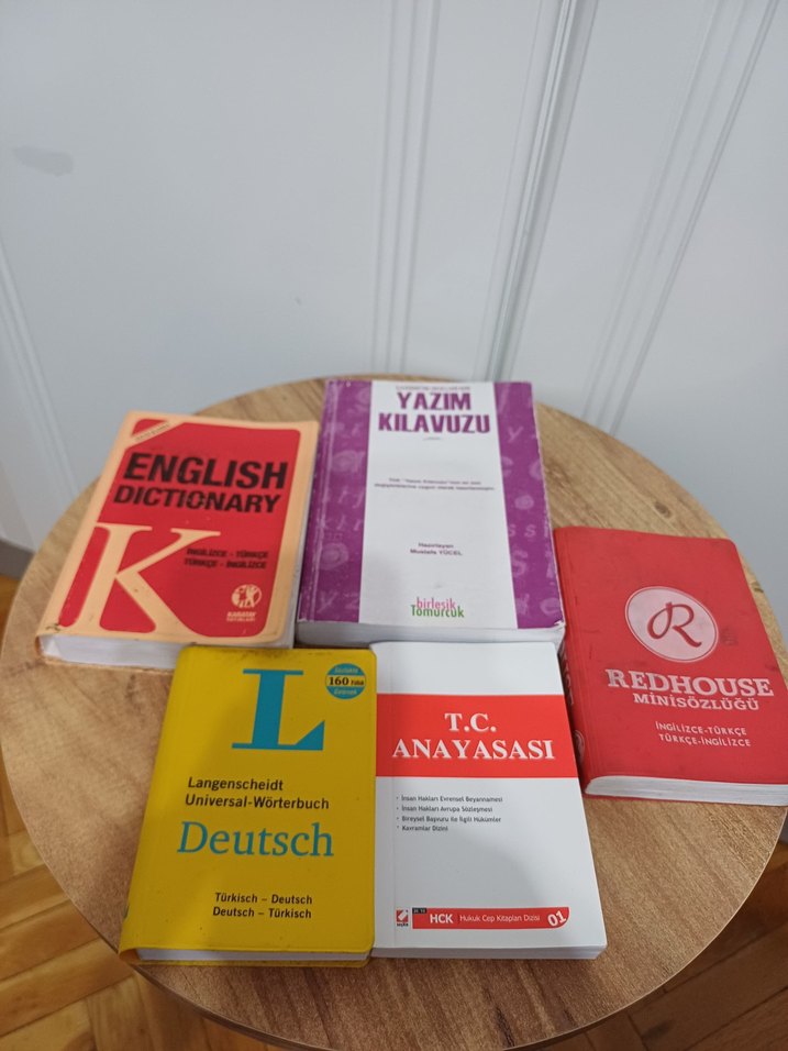 İngilizce ve Almanca sözlükler, Türkçe yazım kılavuzu ve T.C. Anayasası içeren kitap seti. Almanca sözlük ve Anayasa sıfır durumda diğer ürünler biraz kullanmış