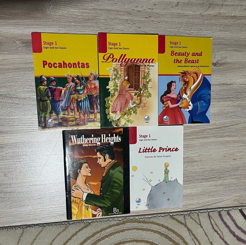 Stage 1 seviyesinde Pocahontas, Pollyanna, Güzel ve Çirkin, Uğultulu Tepeler ve Küçük Prens gibi klasik çocuk kitapları seti.