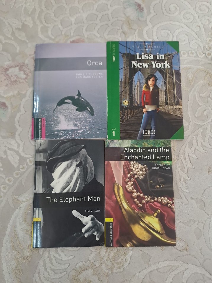 Orca, The Elephant Man, Lisa in New York ve Aladdin and the Enchanted Lamp kitaplarını içeren lise düzeyi kitap seti.