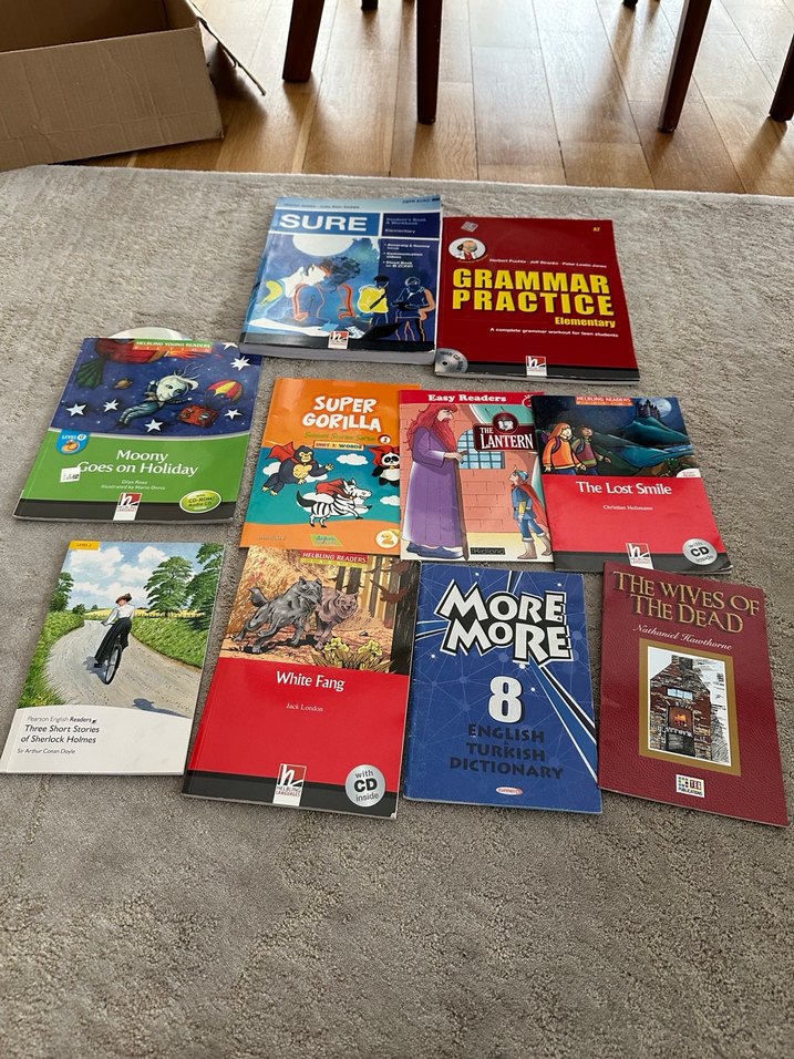 İngilizce gramer kitabı, hikaye kitapları ve İngilizce-Türkçe sözlük içeren ilkokul seviyesinde kitap seti.