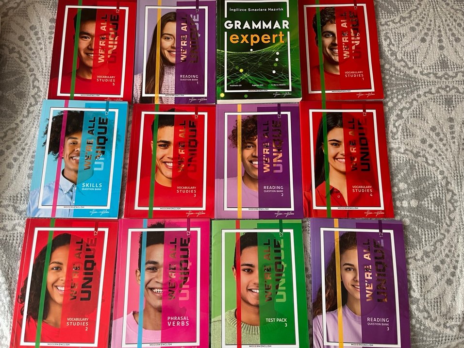 İngilizce sınavlarına hazırlık için grammar expert, test pack, reading, vocabulary ve phrasal verbs kitaplarından oluşan set. 9 tanesi hiç kullanılmadı diğerlerinin de durumu çok iyi