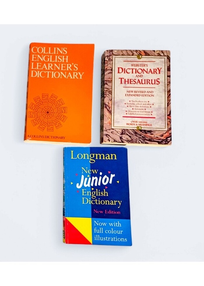 Çocuklar ve öğrenmeye yeni başlayanlar için Longman Junior English Dictionary, Collins English Learner's Dictionary. Yetişkinlet için de Webster's Dictionary and Thesaurus. Collins ve Webster's sözlüklerin sayfalarında sararma var. Bunun dışında sağlam durumdalar.