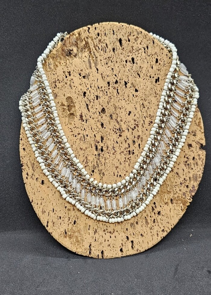 Statement kolyeler, büyük ve dikkat çekici formlarıyla düz tişörtlere feminen bir hava verdikleri için özellikle yaz aylarında favoridir. Gümüş rengi ve beyaz boncuklu bu kolye ile kıyafetleri olabildiğince sade renklerde tutarak, ve başka hiçbir aksesuar kullanmadan gayet sade bir kombini, şık ve etkileyici hale getirebilirsiniz.
