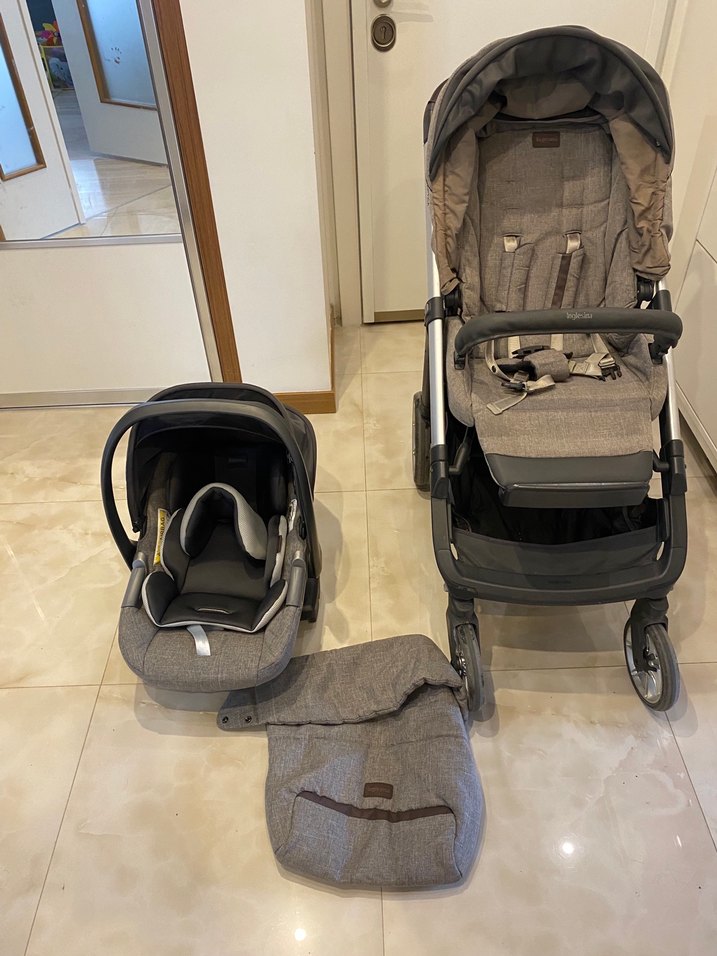 Gri bebek arabası seti, yumuşak ve dayanıklı kumaş, ayarlanabilir emniyet kemerleri ile araba, taşıma koltuğu ve ayak örtüsünden oluşur. Çok sağlamdır . Engelleri çok rahat sarsıntısız geçerek bebek rahatsız olmaz . Kış için koruma örtüsü dahil .