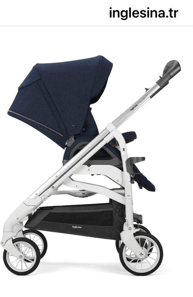 Lacivert oturma alanı ve gri detaylara sahip, beyaz çerçeveli bebek arabası. Geniş tente ve sağlam tekerleklerle konfor sağlar.