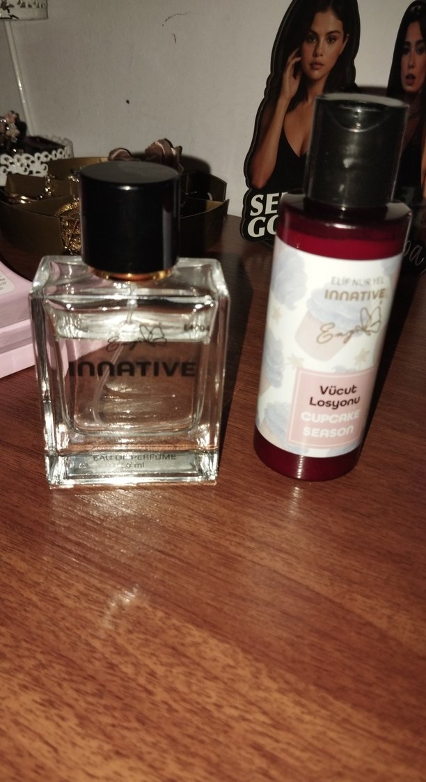 Innative markalı kadın parfümü ve Cupcake Season serisine ait vücut losyonu içeren set. İkisini satıyorum parfüm yarısından çoğu dolu deep wouse kokusu meyveli çekici bir koku yanında vücut kremi vanilya kokuyor oda mini boy içi dolu