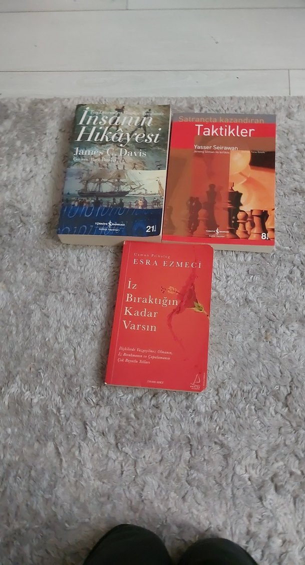 Tane 80 3ünü alırsan 150 tl James C. Davis'in 'İnsanın Hikayesi', Yasser Seirawan'ın 'Satrançta Kazandıran Taktikler' ve Esra Ezmeci'nin 'İz Bıraktığın Kadar Varsın' kitapları.