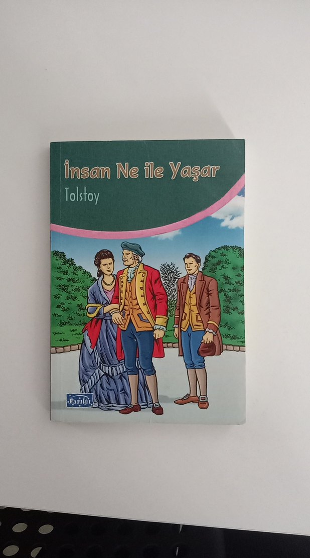 Tolstoy'un "İnsan Ne ile Yaşar" romanı, insan değerleri ve yaşam derslerini klasik bir hikayeyle anlatıyor. Alt kısmında sarımsı bir leke oluşmuş, görsellerde belirtildi