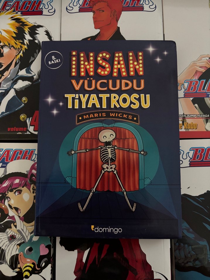 Maris Wicks'in "İnsan Vücudu Tiyatrosu" kitabı, iskelet figürüyle insan vücudunu tiyatral ve esprili bir şekilde anlatıyor. Edomingo yayınevi. Hafif içe doğru katlanma var başka sorunu yoktur.