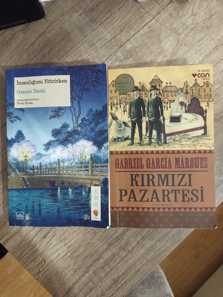 Osamu Dazai'nin "İnsanlığımı Yitirirken" ve Gabriel Garcia Marquez'in "Kırmızı Pazartesi" adlı tarih kitapları, farklı kapak ve edebi temalar içeriyor.