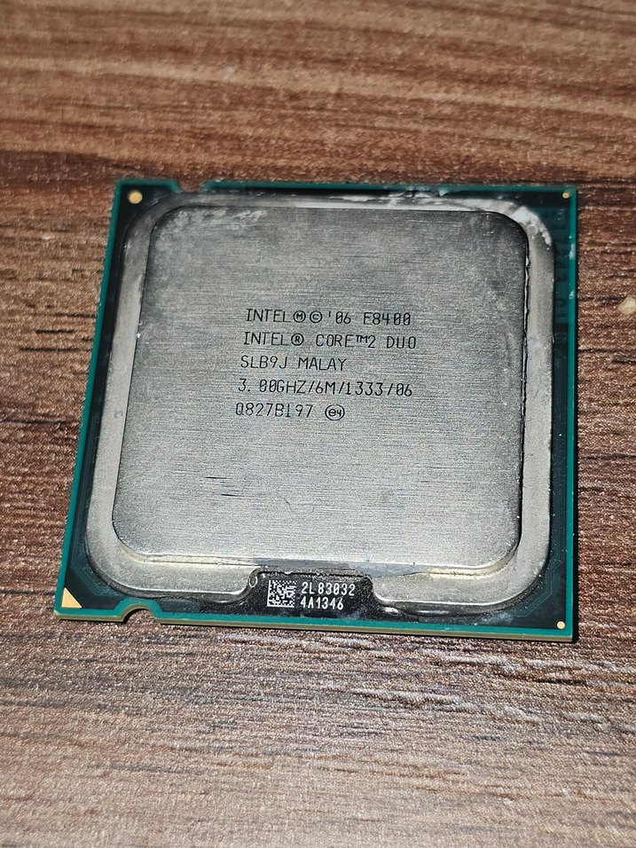 Intel Core 2 Duo E8400 işlemci, 3.0 GHz hızında ve 1333 MHz ön bellek veri yolu ile. SLB9J model, Malezya üretimi. Bej-gri renkte. ⚙️