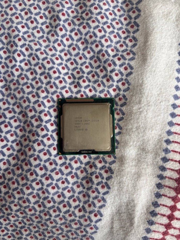 Intel Core i3-2120 işlemci, masaüstü bilgisayarlar için standart tasarıma sahip. Mavi-yeşil devre kartı tabanı bulunur.
