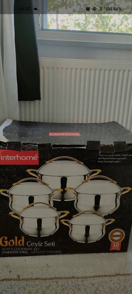 Interhome marka, koyu altın renkli, çeşitli boyutlarda tencere ve kapaklardan oluşan set.