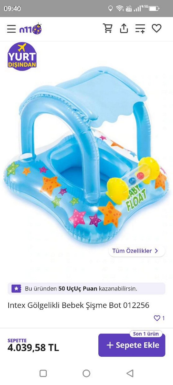 Intex'in renkli yıldız desenli şişme bebek botu, gölgelikli yapısıyla konfor ve güneş koruması sağlar. 1 defa havuzda kullanıldı yarım saat bile değil
