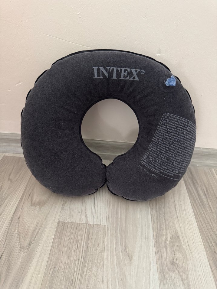 INTEX marka, baskılı desenli siyah gri kumaştan boyun destek yastığı, seyahat ve dinlenme sırasında konfor sağlar.