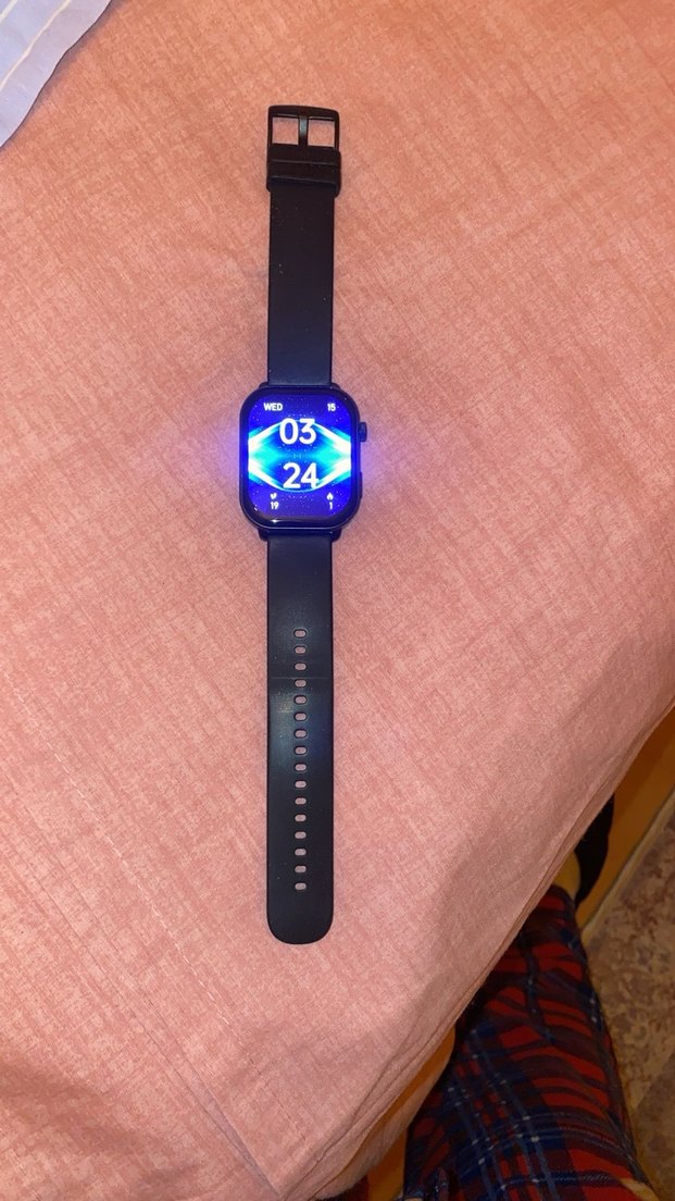 Siyah renkli, dijital ekranlı akıllı saat. Koyu renkli şık kayış ve mavi tonlarda net ekran içerir. ⌚
