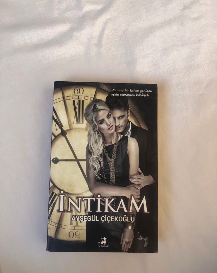 Ayşegül Çiçekoğlu'nun İntikam adlı romanı, aşk ve intikamı konu alıyor. Kapakta çift ve büyük bir saat yer alıyor. ⏳