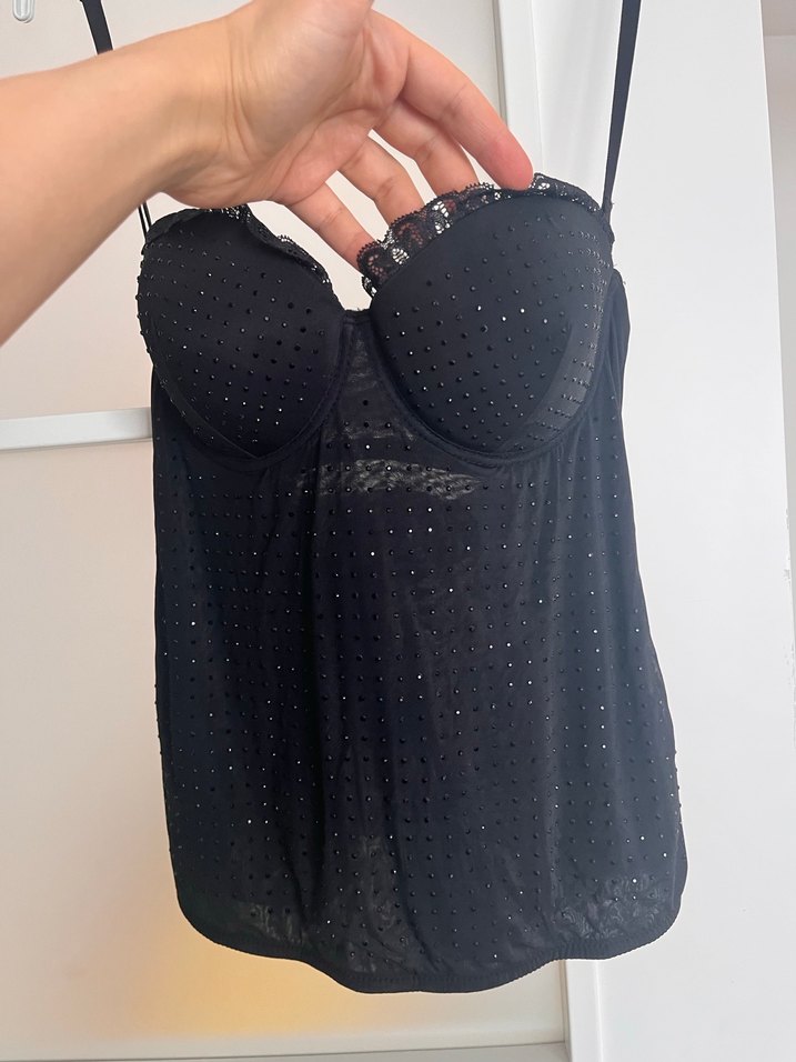 Siyah, straplez ve askılı kollu, parlak taş işlemeli sentetik kumaştan yapılmış, vücuda oturan midi boy bustiyer. Romantik gece için uygun gotik tarzda.