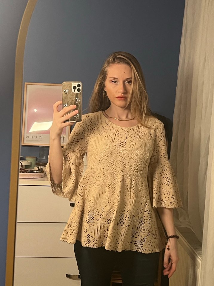 Bej renk, dantel detaylı, uzun kollu, yuvarlak yaka ve bol kesim bohem kadın bluz. Günlük kullanım için uygundur.