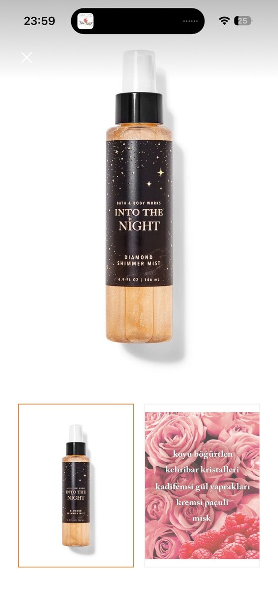 Into The Night Diamond Shimmer Mist, kehribar kristalleri ve kadifemsi gül yaprakları ile ışıltılı bir koku sunar. Bath & Body Works markasının into the night serisinin ışıltılı vücut spreyi. Simli olduğu için kullanamadım. Şişenin seviyesi görsellerde mevcut, inceleyebilirsiniz. #bodyspray #simli #glittery #vücutspreyi #bath #body #works #parfüm