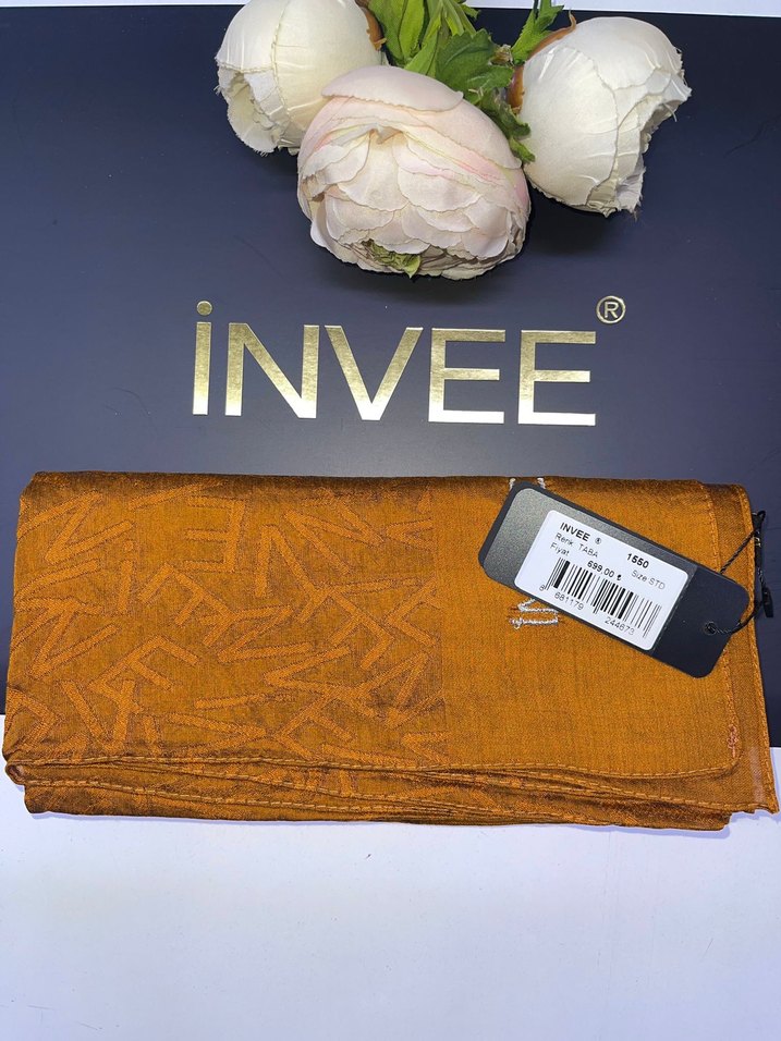 Parlak kahverengi, ince desenli tekstil şal, INVEE markalı. İş ve bohem tarzı için uygun, zahmetsiz şıklık katıyor. İstediğiniz renk için ilan açtırınız