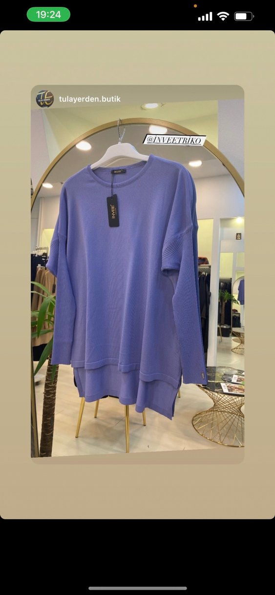 Mor, uzun kollu, salaş kesim triko tunik. Sentetik yumuşak kumaştan örülmüş, pastel tonlarda, günlük ve sokak stiline uygun. @inveetriko