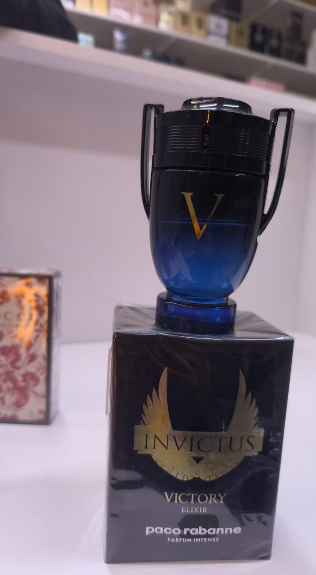 Koyu mavi renkte, Invictus Victory erkek parfümü. Şık kanatlı logo ve büyük 'V' harfiyle dikkat çeker. ️