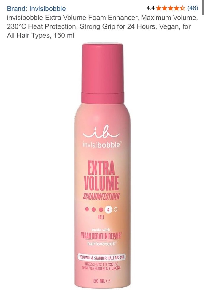 Dörtte biri anca kullanılmıştır. Yurtdışı ürünü. Saç şekillendirici, ısı koruyucu, hacim verici. Markası: invisibobble/ extra volume SCHAUMFESTIGER/ vegan keratin repair/ ohne silikone invisibobble Extra Volume köpük, 24 saat güçlü tutuş ve maksimum hacim sağlar. 230°C'ye kadar ısı koruması sunar, vegan ve tüm saç tipleri için uygundur. 150 ml.