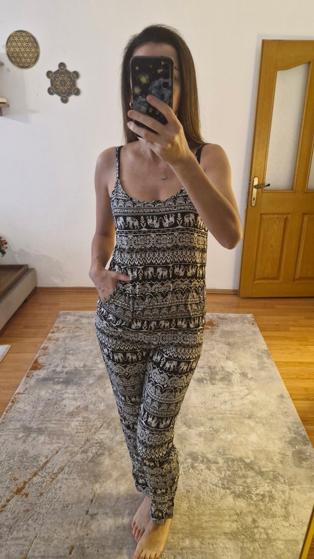Üzerinde beyaz fil desenleri olan penye kumaştan siyah ip askılı tulum. Cepleri, tek parça oluşu ve kumaş hafifliğinden dolayı yazın vazgeçilmez parçası. Paçalara doğru daralıyor. Tarz sahibi bir tulum
