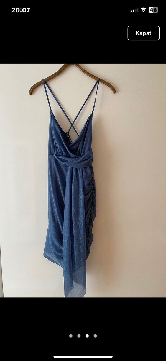 Lacivert midi elbise, drapeli tasarımı, fitted kesimi ve askılı V-yaka ile romantik akşamlar için uygun. Minimalist ve bohem tarzda şık bir parça.