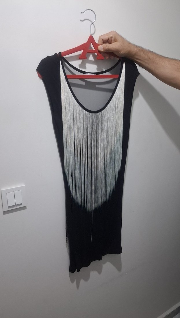 yuvarlak yaka, kolsuz, vücuda oturan siyah kısa abiye elbise,ip detaylı baskılı desene sahiptir. Avant-garde ve goth tarzı partiler için uygundur.
