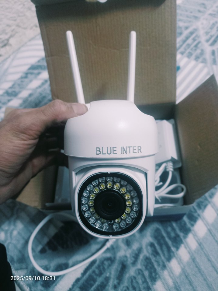 Çift antenli, gece görüş LED'li açık mavi kablosuz e kamerası. Üzerinde 'BLUE INTER' yazısı ve tarih bulunur.