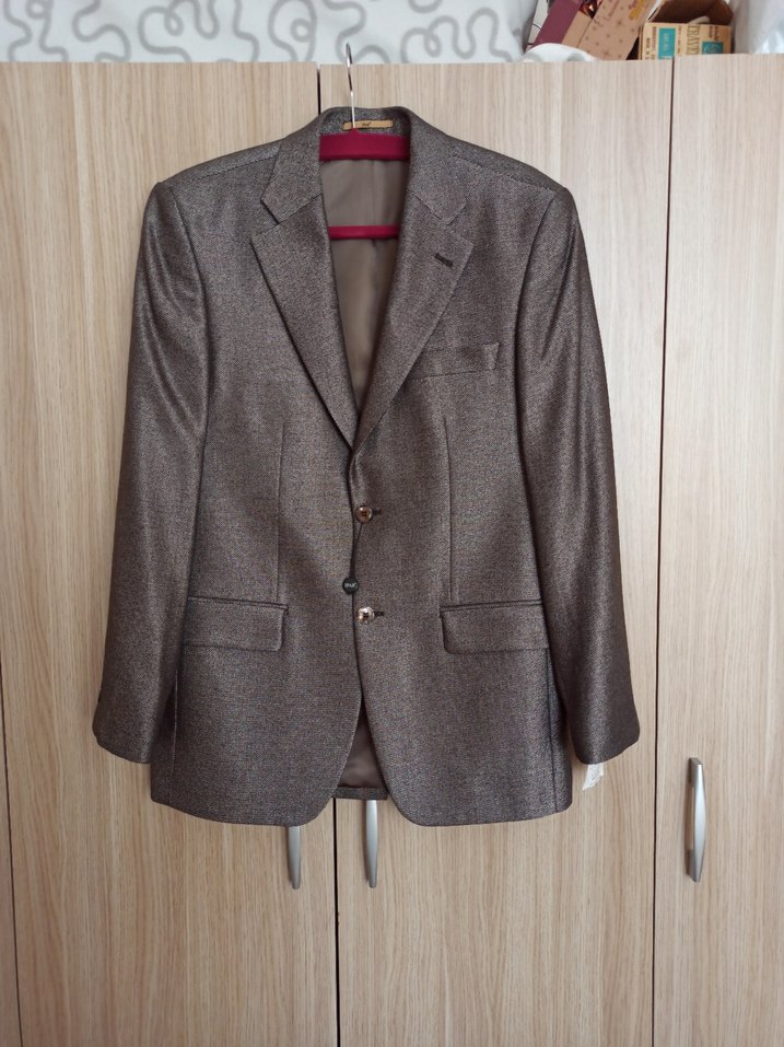 Kahverengi-bej renkli, modern klasik tarzda, düğmeli ve normal boy midi uzunluğunda erkek ceket. Notch yaka ve uzun kolludur, ofis kullanımına uygundur. Hiç kullanılmamıştır, biraz parlak renkli, 46 beden 6 drop