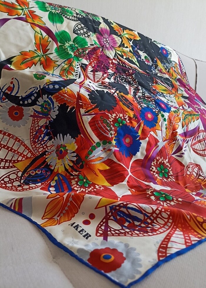 Aker marka orjinal ipek eşarp. sura yumuşak ipeklerdendir. dolgun kaliteli bir ipeği var kolayına yipranmaz delinmez çok güzel ipeği. az kullanıldı.yirtik delik defo yok. son resimdeki su lekesi gibi leke var belli olmuyor. iğne ile kullanıldı. capcanlı renkleriyle alana hayırlı olsun