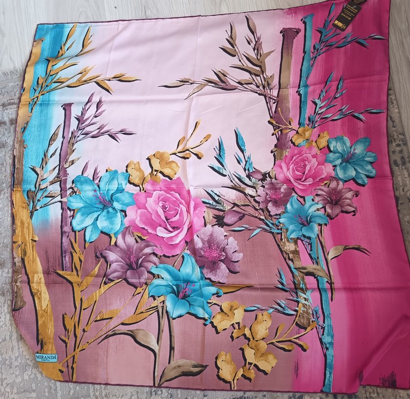 İpek dokulu pembe fular, canlı pastel çiçek desenleriyle bohem ve retro tarzı yansıtır, hippie görünüm için ideal.