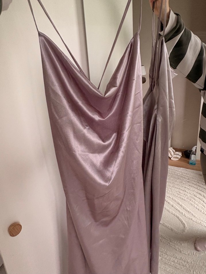 İpek görünümlü, drapeli saten ve askılı V yakalı bohem midi elbise, mor tonlarında, Paris tarzı ve günlük kullanıma uygun. Yenidir bir kere bile giyilmedi . Hediye geldi geldiği gibi duruyor
