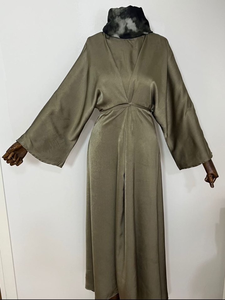 1 beden (36-38-40) uyumludur İpek saten kumaştır Bu uzun elbise, geniş kesim ve uzun kollu modern tarzda, düz ve gri tonlarında kumaşa sahiptir.